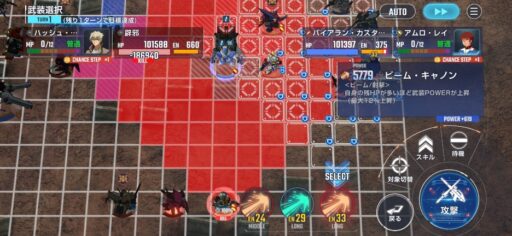 レンジブーストを使用したバイアランカスタム2号機を画像位置の攻撃アップマスに移動させて、下にいる辟邪を攻撃しましょう