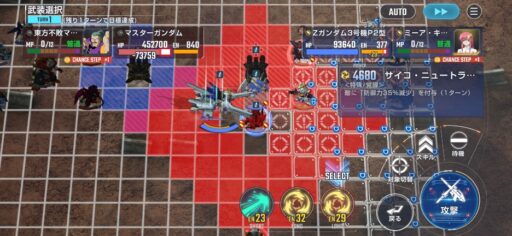 Zガンダム3号機P2型を画像位置に移動させてペーネロペーに攻撃して防御力デバフを付与