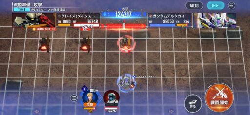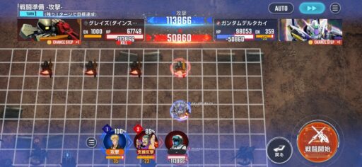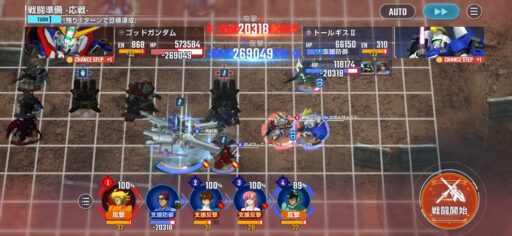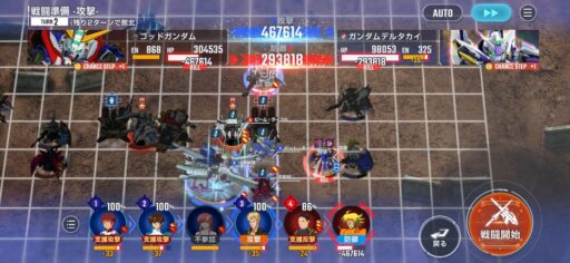 デルタカイを画像の攻撃アップマスに移動させて、支援攻撃を含めてゴッドガンダムを撃破しましょう