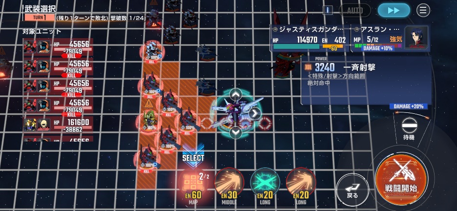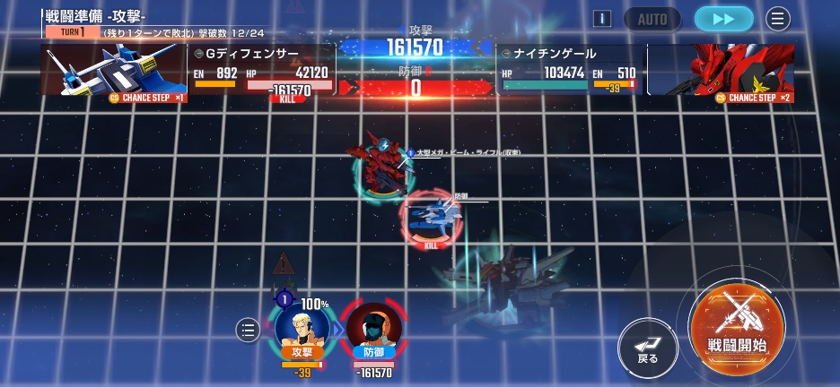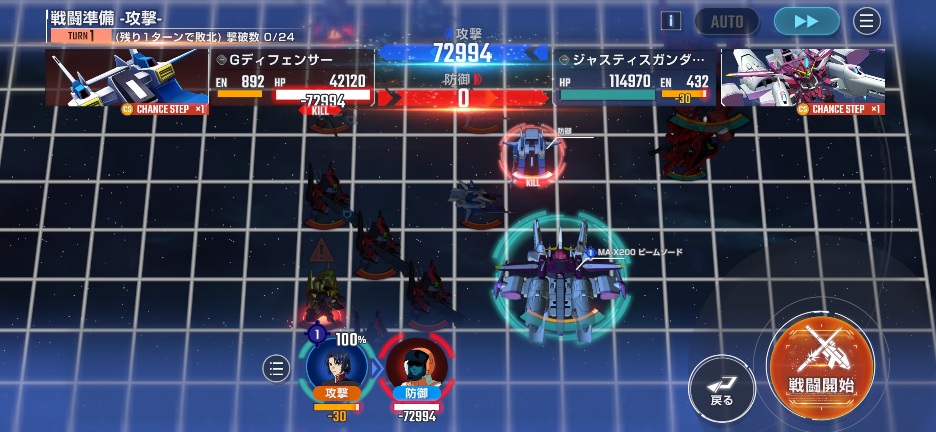 ジャスティスミーティアを画像位置に移動させて、Gディフェンサーを攻撃