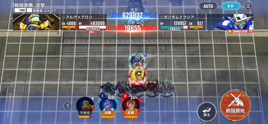 自軍2ターン目になると味方援軍としてエクシアが登場します