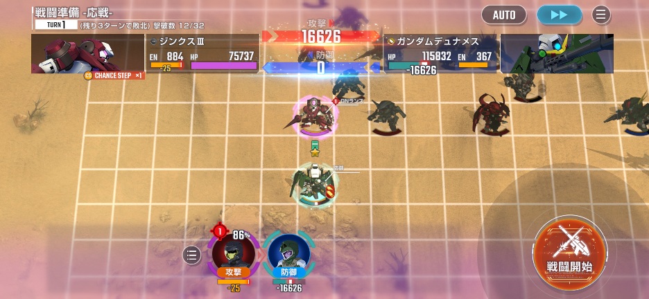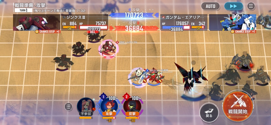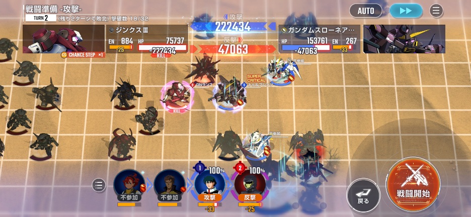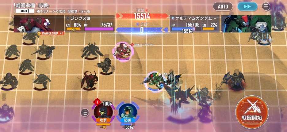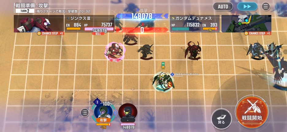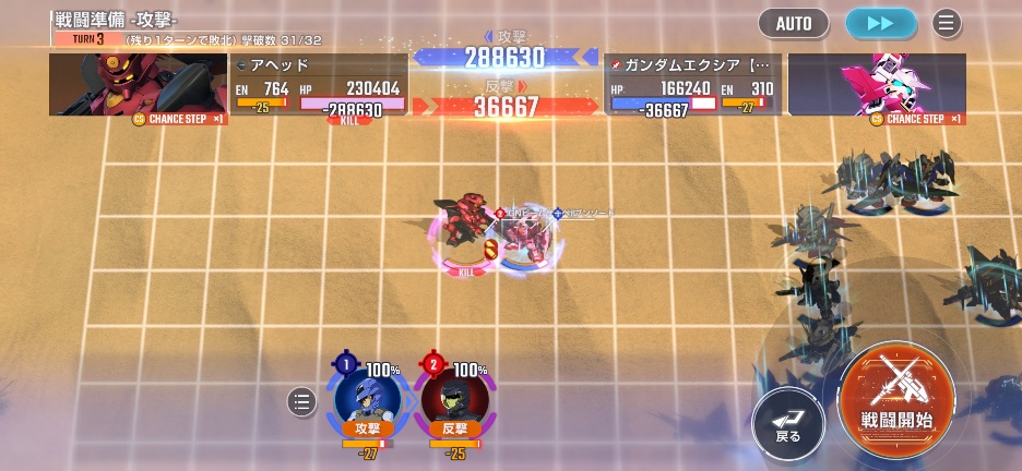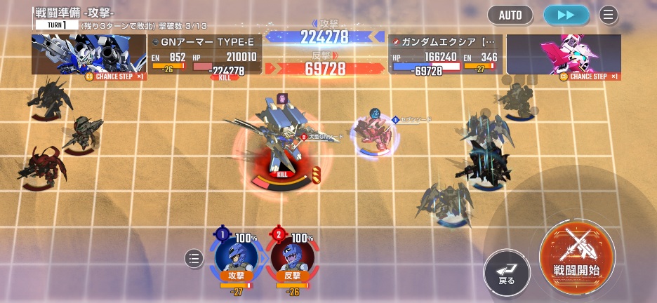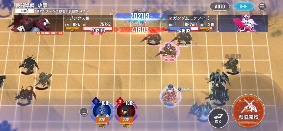 ガンダムエクシア【TRANS-AM】を画像位置に移動させて、ジンクスⅢを撃破