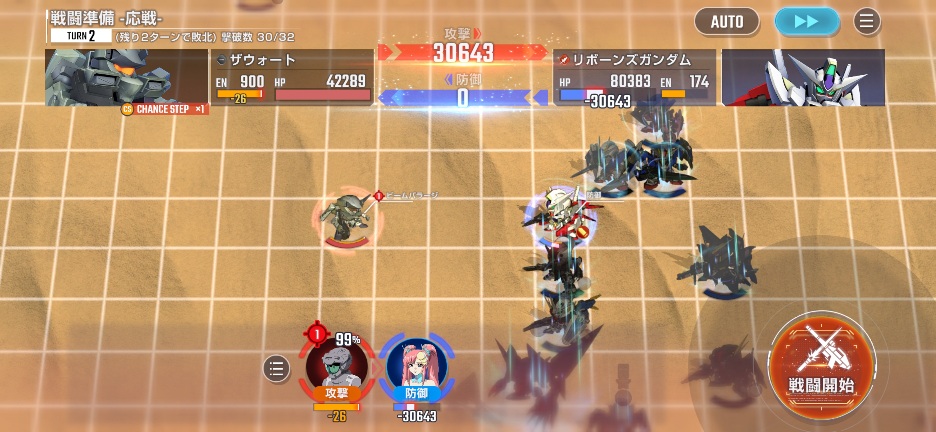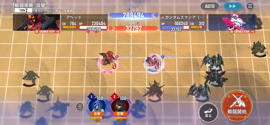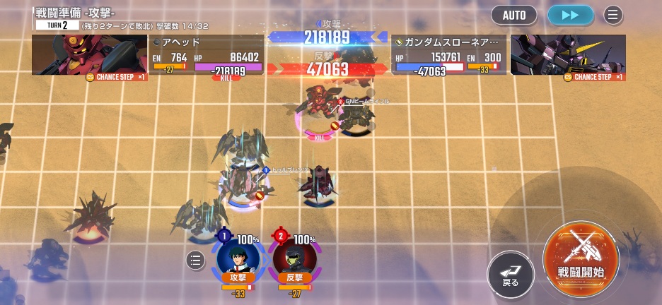リボーンズガンダムを画像位置に移動させてアヘッドを攻撃