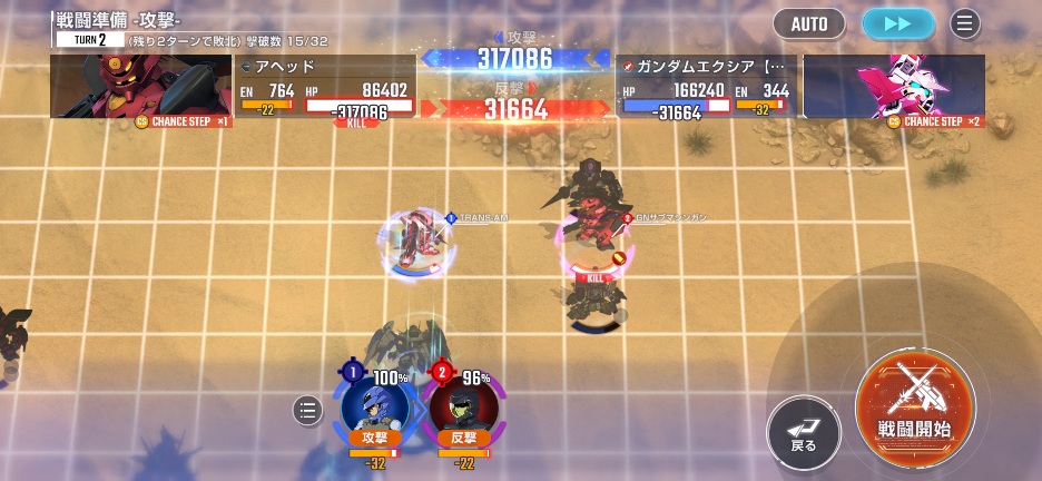 ガンダムエクシア【TRANS-AM】を画像位置に移動させてアヘッドを撃破