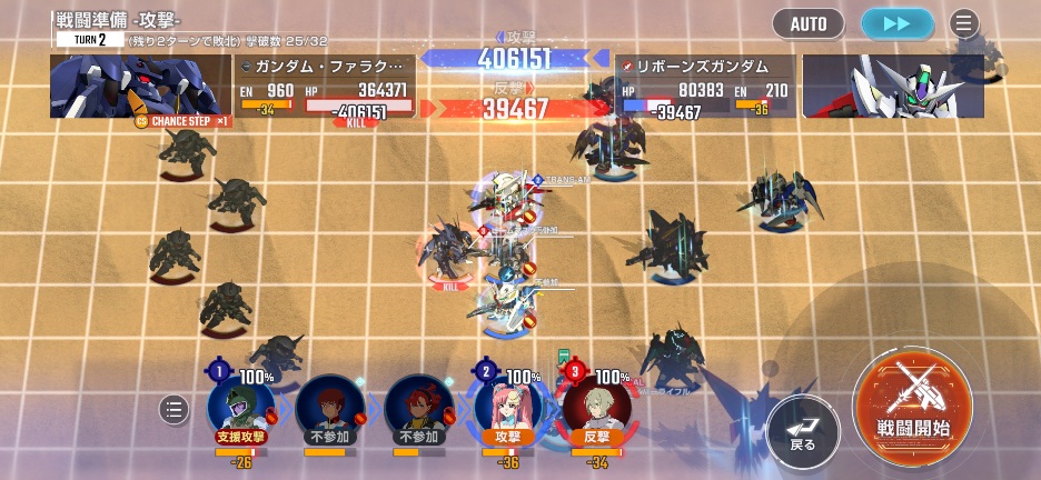 リボーンズガンダムを画像位置に移動させて支援を入れながらファラクトを撃破