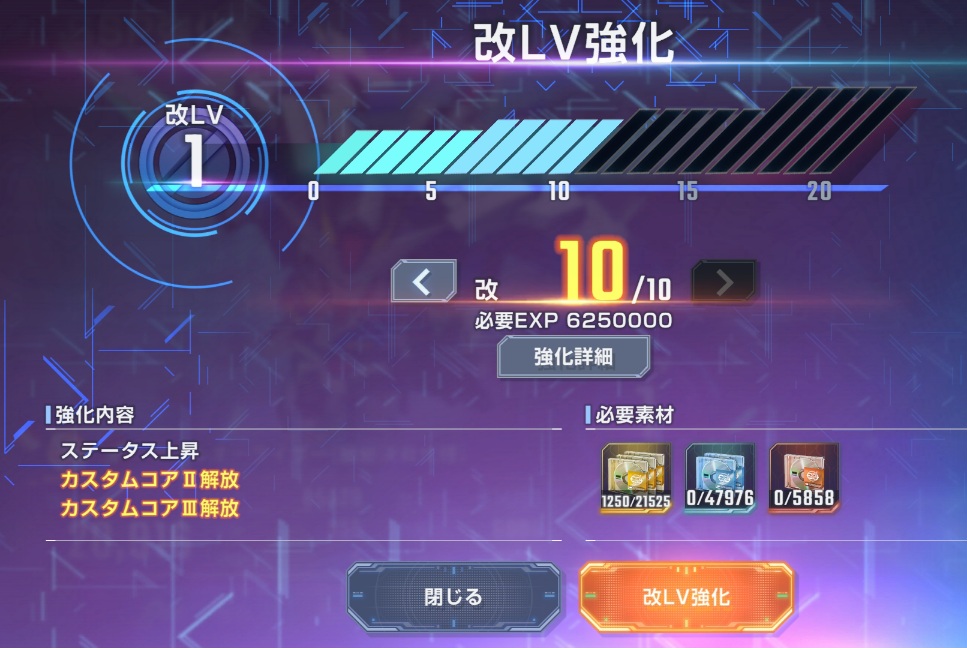 改LV10にするにSSRユニット強化データを1250個消費しました