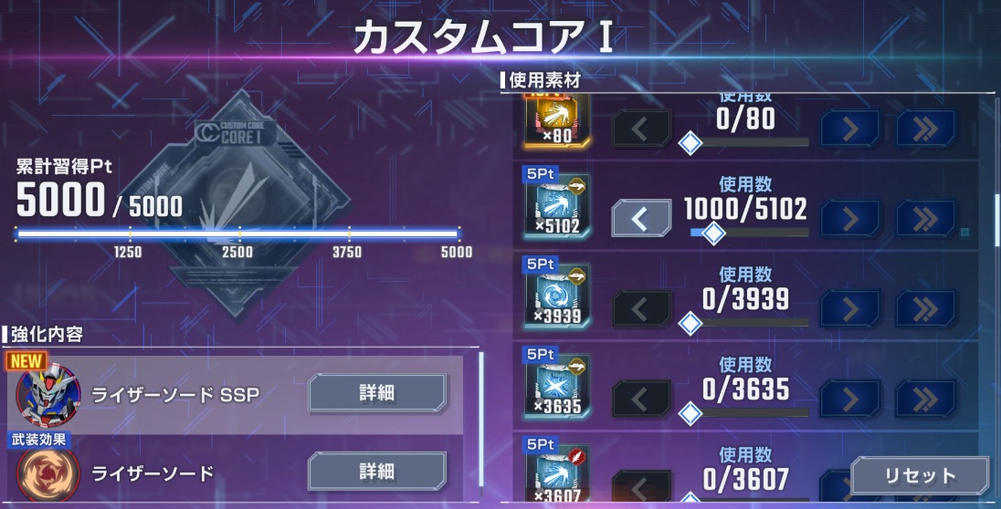 カスタムコアⅠは武装強化素材を5000ポイント消費して最大にすることができます