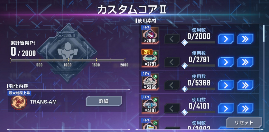 カスタムコアⅡはシリーズ開発素材を2000個消費することで最大にすることができます