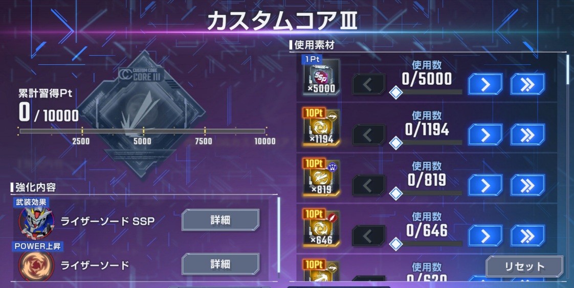 カスタムコアⅢは武装強化素材を10000ポイント消費することで最大にできます